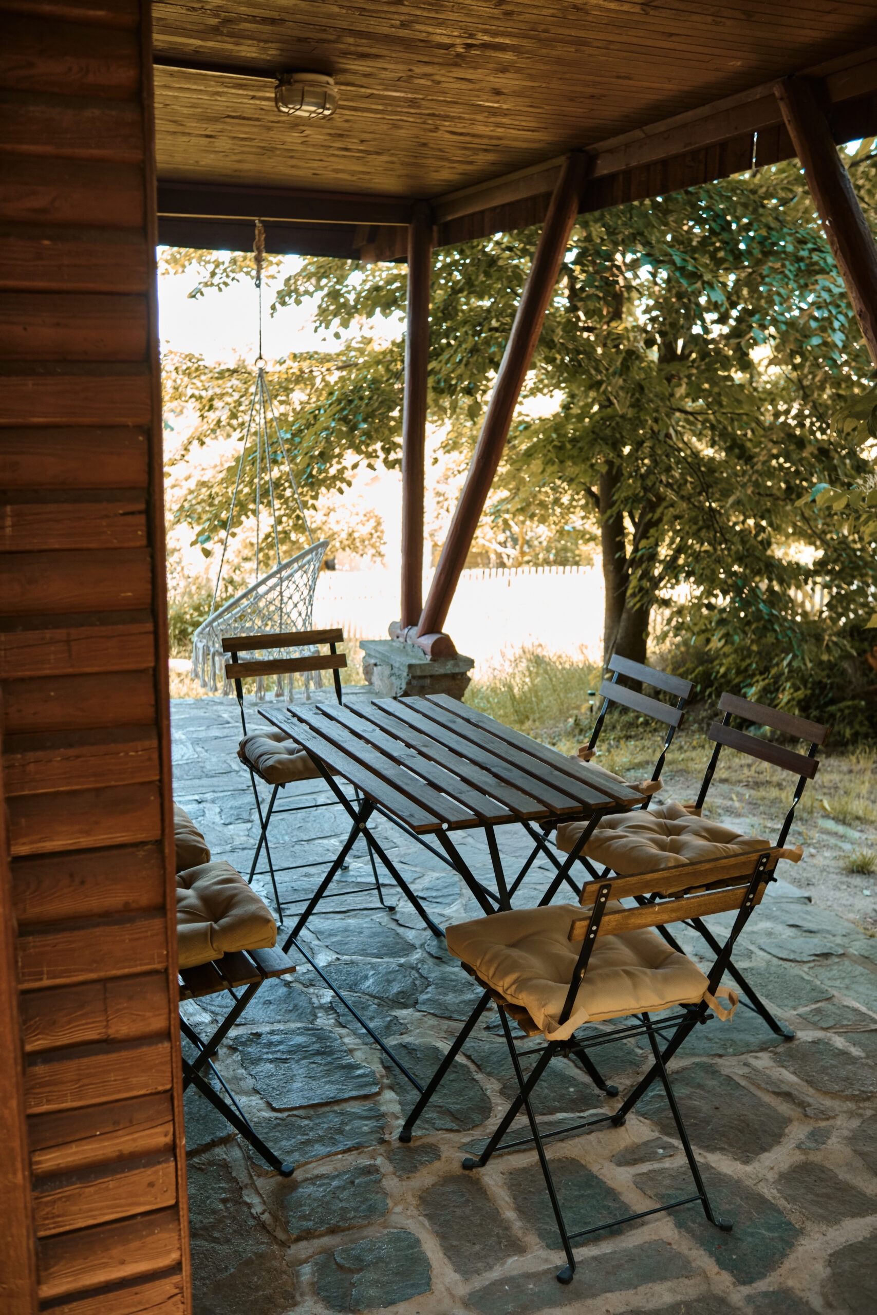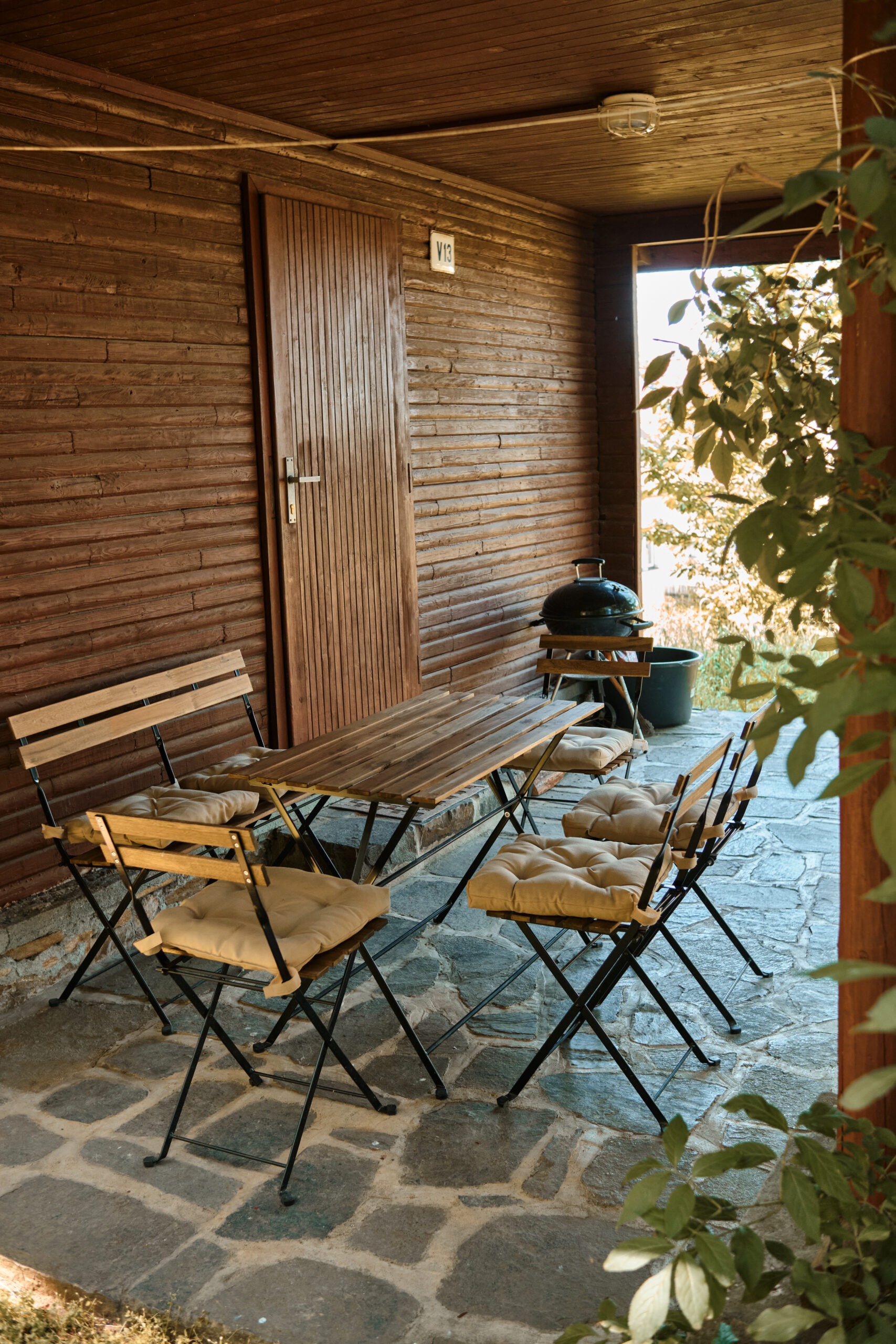 Venku je zastřešená veranda, kde se dá v klidu vypít ranní káva (moka konvička je součástí kuchyňského vybavení), nebo posedět u grilování (malý gril je taktéž součástí vybavení chaty).